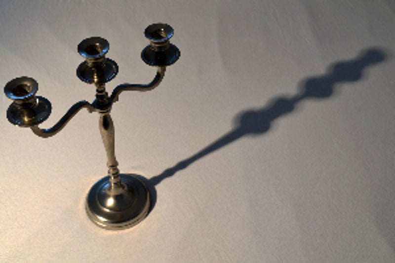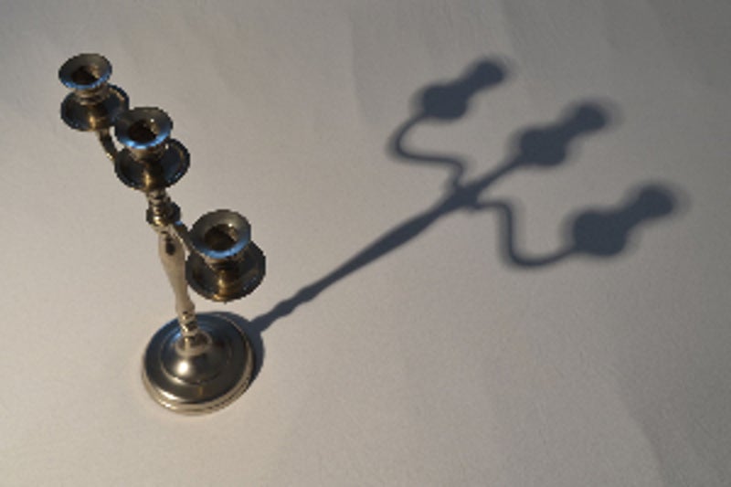 Mijn oog was gevallen op een grote kandelaar, met die vorm ging mijn gedachten uit naar een mooie schaduw. Eerst de kandelaar maar een beetje op gepoetst aangezien deze al een aardige tijd boven in de kast heeft gestaan. Om de kandelaar goed in beeld te krijgen en de achtergrond (eigenlijk de ondergrond) goed op de foto te krijgen moest ik met de camera en statief nog hoger dan mijn statief aankon. Dan maar wat verzinnen.... Ik heb daarom het statief op de eetkamer stoelen gezet. Vanaf daar kon ik een juiste positie vinden voor een goede compositie. (Ik kon uiteindelijk ook de kandelaar lager plaatsen)