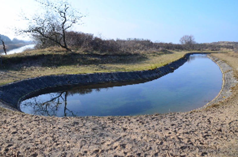 Het was van korte duur, waarschijnlijk omdat we met z'n alle rond haar stonden is ze weg gegaan. Zo ook wij vervolgde onze wandeling op zoek naar mooie natuur en dieren. Na een paar uurtjes te hebben gelopen en weinig interessante dingen te hebben gezien hadden we bij een open plek een pauze ingelast. Even wat eten, drinken en om op adem te komen van de flinke wandeling. Achter een paar struiken zag ik een mooie plek met water. Hieronder staat een foto ervan. Daar zijn we op het zand gaan zitten en hebben erg genoten van het uitzicht.